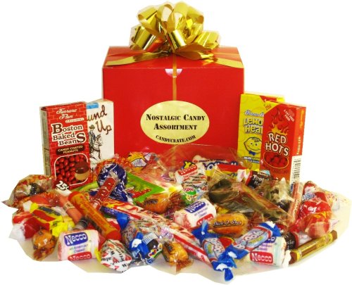 This Nostalgic Candy Gift Box is a real Blast from the Past! Over 50 pieces of classic old fashioned candy favorites including Boston Baked Beans, Bottlecaps, Bubble Gum Cigars, Candy Cigarettes, Caramel Apple Pops, Charms Sweet & Sour Pops, Cinnamon Toothpicks, Fun Dip, Hot Dog Cinnamon Gum, Lemon Heads, Licorice Pipe, Long Boy, Red Hots, Sugar Daddy Pops, Zotz, Atomic Fireballs, Bazooka Bubble Gum, Bit O Honey, Candy Necklace, Chick O Stick Nuggets, Jaw Breakers, Necco Wafers, Root Beer Barrels, Salt Water Taffy, Tootsie Roll Midgees, Wax Lips & Walnettos.